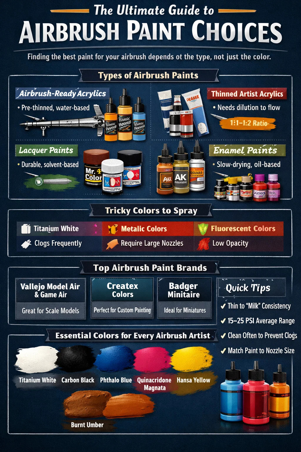 Si vous voulez une réponse directe et sans détours — Les peintures acryliques prêtes à l'aérographe sont le meilleur choix complet pour la plupart des utilisateurs d'aérographe. , que vous peigniez des modèles réduits, des baskets personnalisées, du cake art, du body painting ou des toiles d'art. Ils sont à base d'eau, non toxiques, sèchent rapidement et sont formulés avec des particules de pigment suffisamment fines pour circuler à travers les buses de l'aérographe sans se boucher. Des marques comme Vallejo, Createx et Badger Minitaire sont en tête de cette catégorie pour une bonne raison.