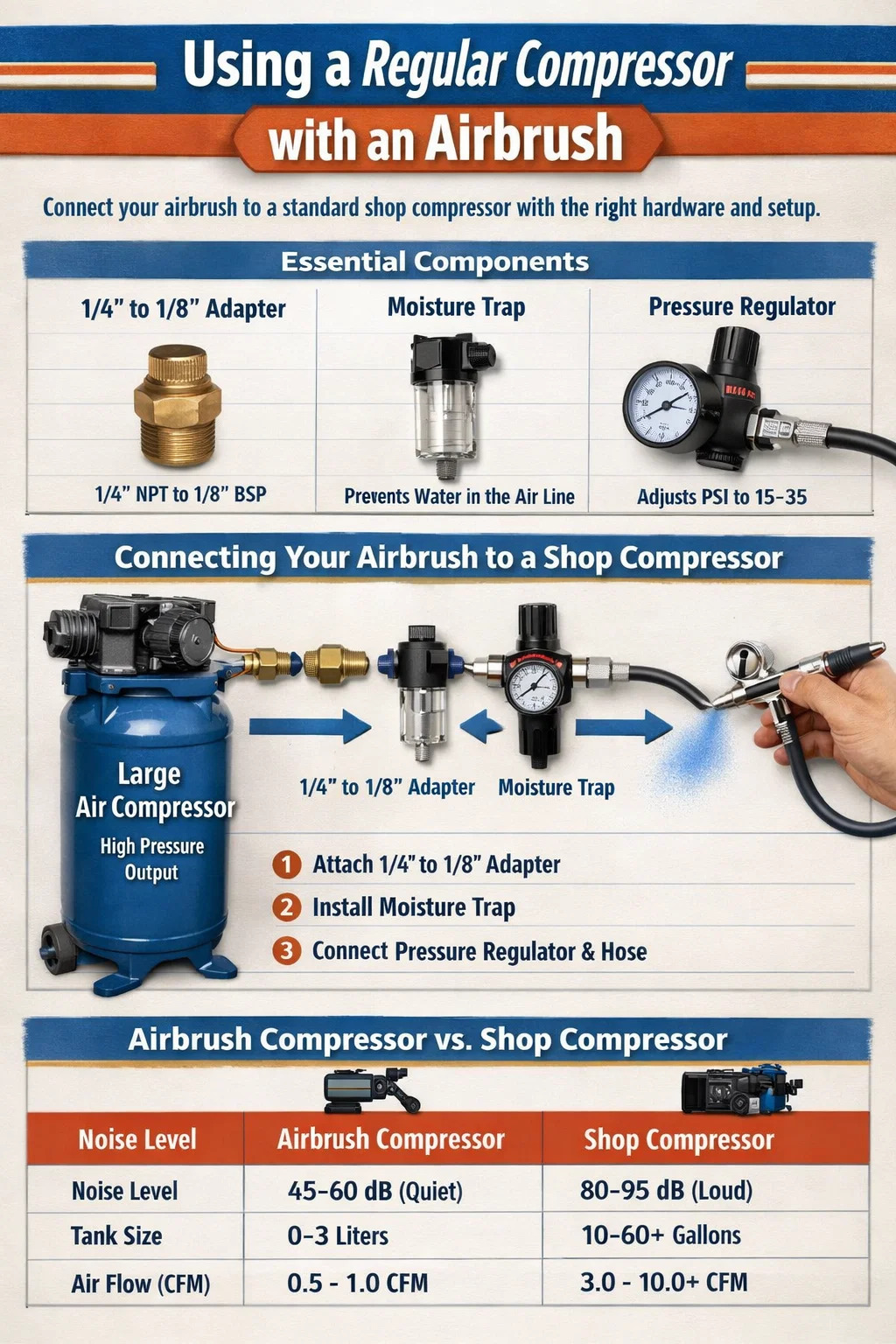 Le plus grand risque lié à l’utilisation d’un compresseur ordinaire est la quantité de pression qu’il peut générer. La plupart des tuyaux d'aérographe ne sont conçus que pour jusqu'à 50 ou 60 PSI . Si le compresseur de votre atelier est réglé à sa puissance maximale (souvent 125-150 PSI), vous risquez éclater le tuyau de l'aérographe ou endommager les joints internes délicats de l'aérographe lui-même.