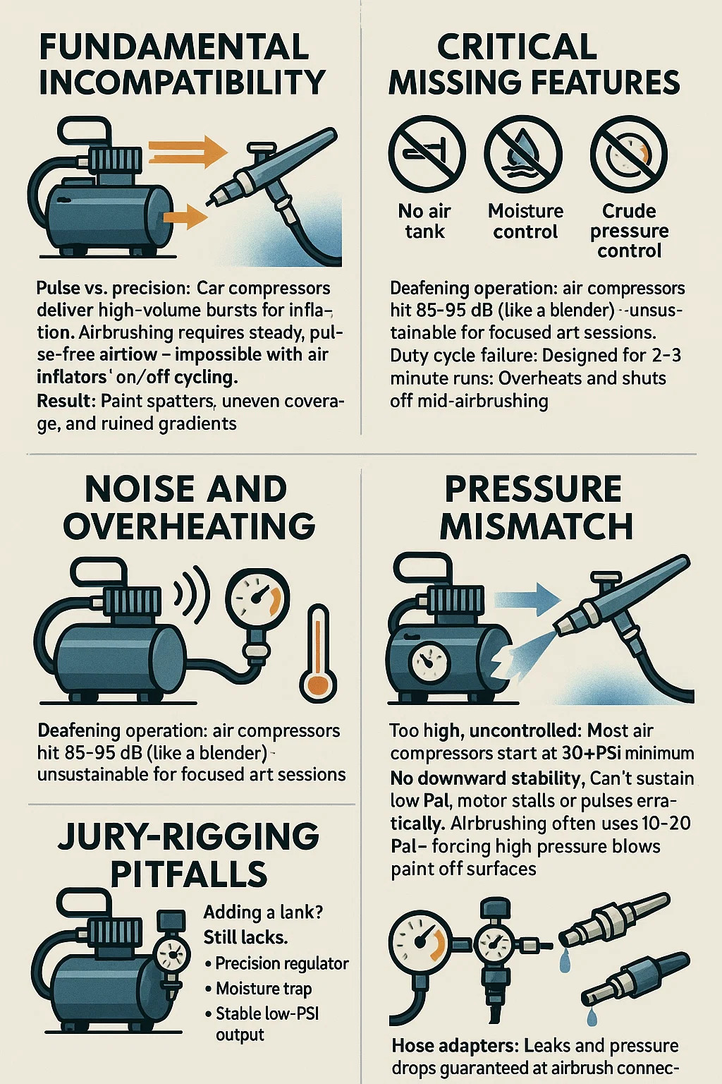 Pas de réservoir d'air : un cyclage constant du moteur crée de violentes poussées de pression. Les compresseurs aérographes utilisent des réservoirs pour fluidifier le flux d’air.