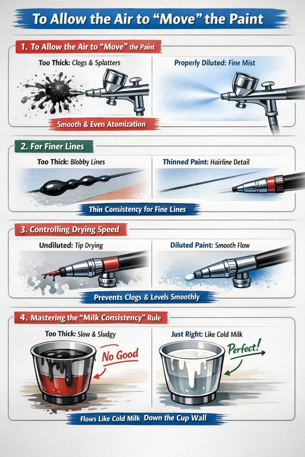 Empêcher le « séchage de la pointe » : si elle n'est pas diluée, la peinture sèche souvent sur la pointe de l'aiguille avant même d'atteindre la surface de l'objet. Cela provoque un colmatage de plus en plus important de l'aérographe.