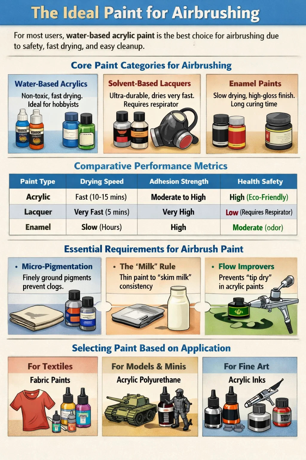 Pour la grande majorité des utilisateurs, peinture acrylique à l'eau est le meilleur choix pour l'aérographe. Il offre un équilibre optimal de sécurité non toxique, temps de séchage rapides et nettoyage facile avec de l'eau simple ou des nettoyants spécialisés. Alors que les amateurs avancés peuvent utiliser des laques pour une durabilité extrême, les acryliques sont la norme de l'industrie pour l'illustration générale, le modélisme à l'échelle et le travail textile en raison de leur polyvalence sur diverses surfaces et de leur odeur chimique minimale.